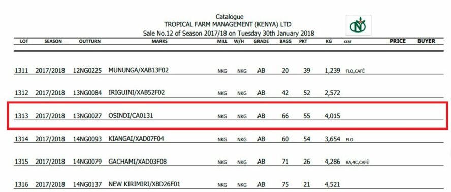 Las subastas se llevan a cabo cada martes y con anterioridad se preparan muestras para que los interesados puedan recogerlas y catarlas antes de acudir a la compra. Los comercializadores que ponen los cafés en la subasta proporcionan además un listado que recoge amplia información sobre cada lote, lo que proporciona transparencia y trazabilidad a pesar de no tener relación directa con los productores. Veamos un ejemplo: