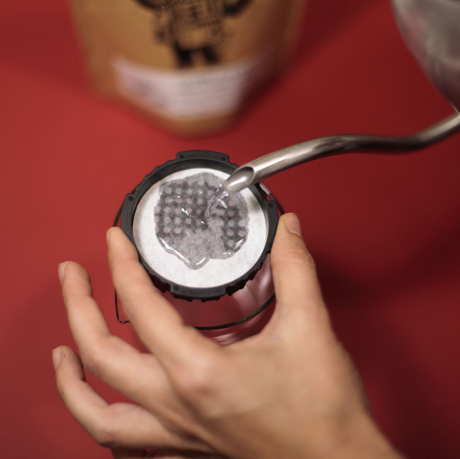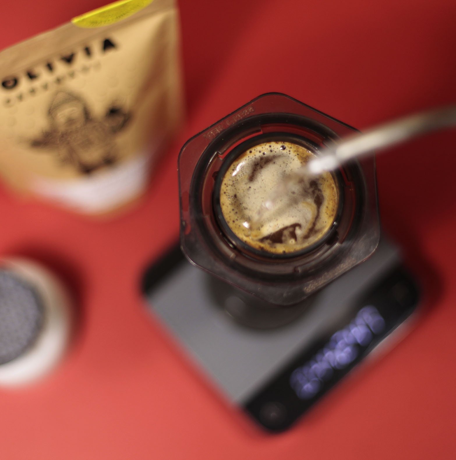 Es hora de colocar tu AeroPress encima de la báscula y tararla. Empieza vertiendo 100gr de agua lentamente, luego mueve todo el café con movimientos muy suaves en cruz. ¡Ten cuidado de no crear turbulencia!