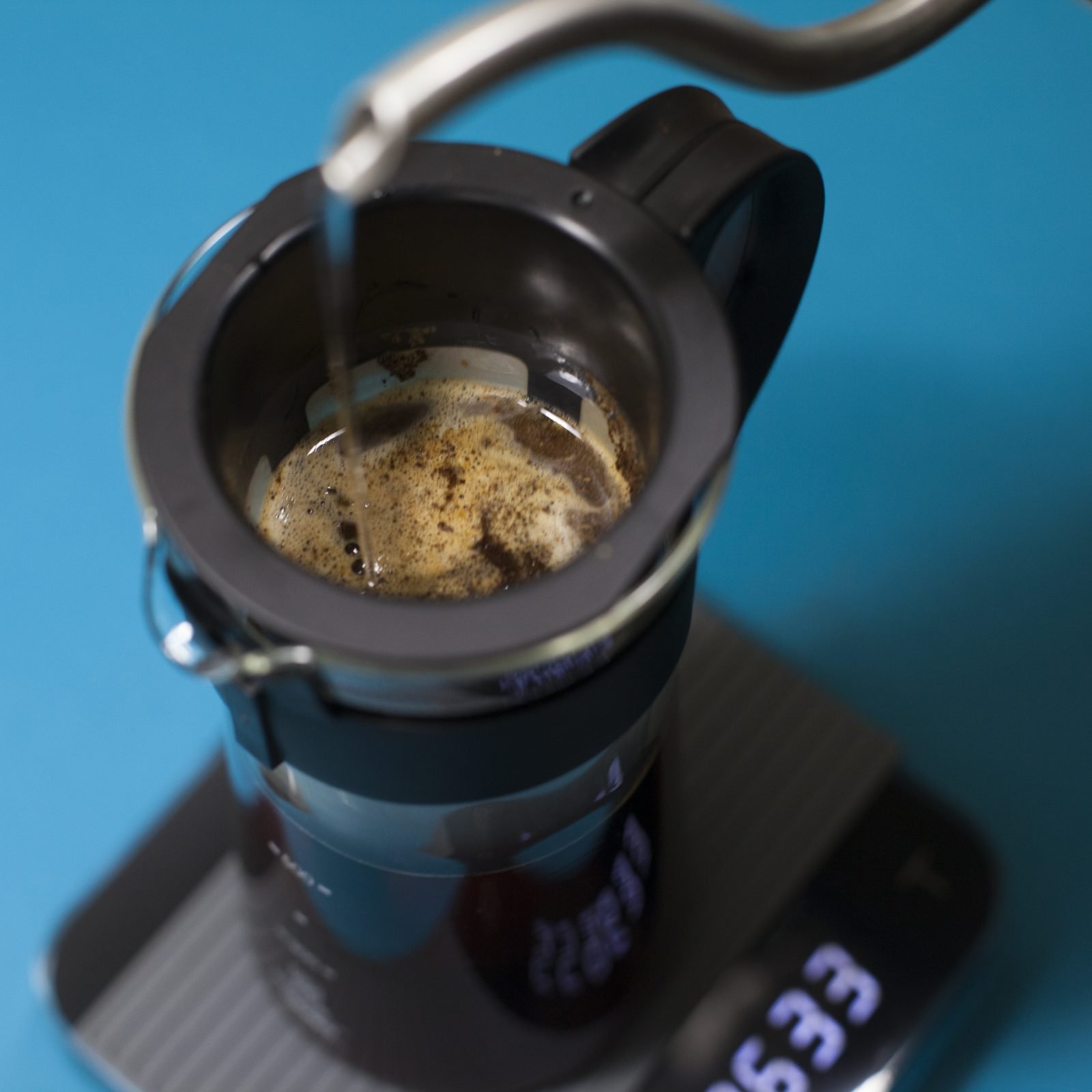 Deposita una mitad de tu café (30g) en el filtro del Hario Cold Brew. Inicia tu cronómetro y añade lentamente 300g de agua a temperatura ambiente.