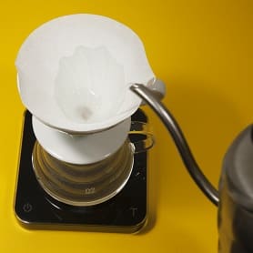 En primer lugar, dobla el lateral del filtro de papel para que se amolde perfectamente dentro de tu V60. Vierte agua caliente sobre el filtro empapándolo bien para eliminar sabores a papel y conseguir que cerámica y jarra cojan temperatura.