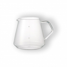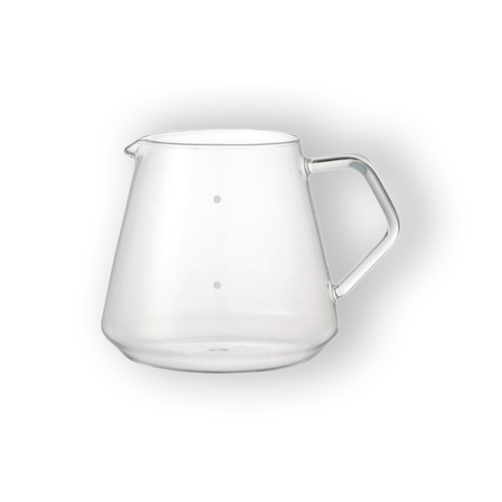 Jarra de vídrio resistente al calor. Cuenta con dos puntos blancos para indicar la cantidad de café extraído.
