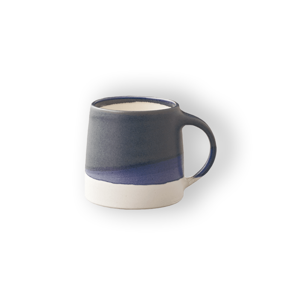 Taza de porcelana hecha a mano. Los rastros del trabajo manual en la rueda de alfarero y los dos colores de esmalte en capas hacen que el carácter de esta taza sea original y genuino. Además, su forma está pensada para que se adapte bien dentro de tus manos y el mango ancho y arqueado la hace muy cómoda de usar.