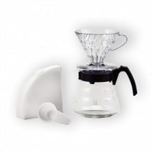 Una forma fácil y económica para hacerte con todo lo que necesitas para preparar un buen café de filtro; cafetera V60, filtros y jarra de cristal. Una buena opción para regalar o iniciarse en el maravilloso mundo de la extracción por goteo.